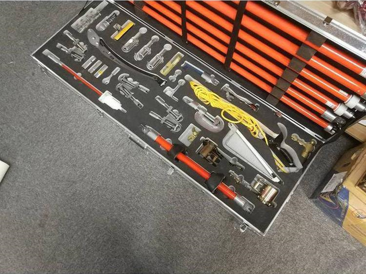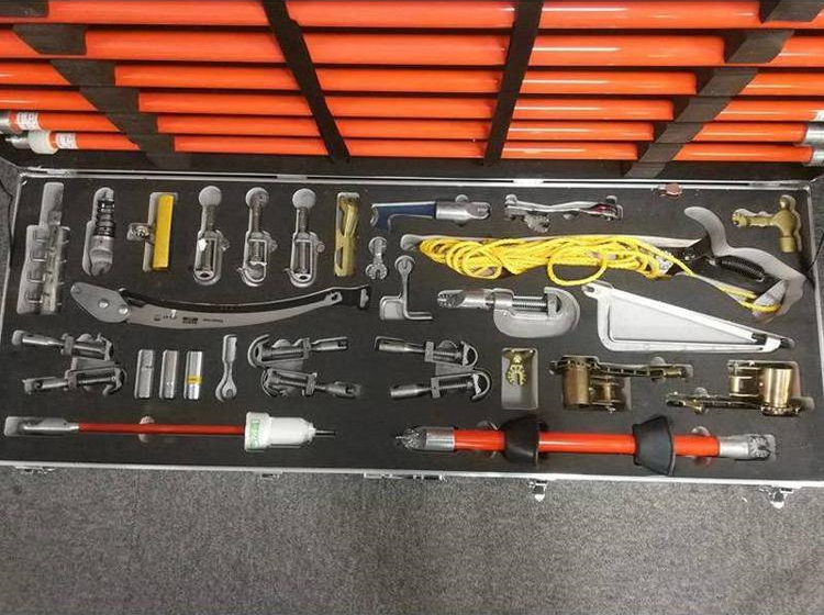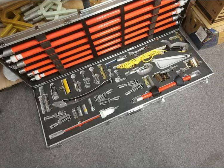 3.配置:修枝剪、修枝鋸、錘頭、鋼鋸、棘輪扳手、套筒、靈活扳手頭、異物切割刀、異物剝離器、導線刷、交換母頭、交換公頭、拉閘桿接頭、萬向刀刃頭、鏟叉、卡線鉤、鎖頭、繞線器、并線器、防雨操作桿、驗電器、絕緣螺旋接頭操作桿