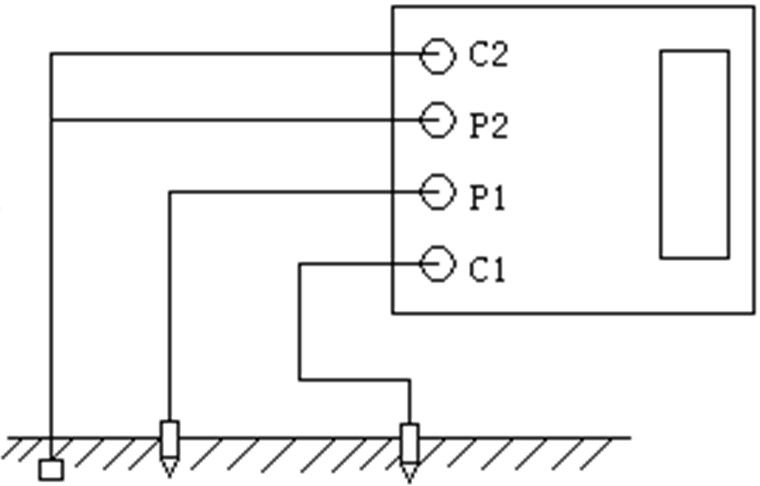 1、測量保護接地電阻時,一定要斷開電氣設備與電源連接點。在測量小于1Ω的接地電阻時,應分別用專用導線連在接地體上,C2在外側P2在內側(如下圖)所示: